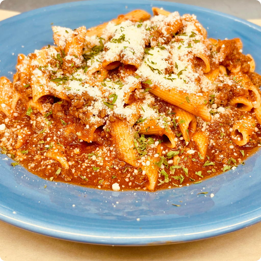 Penne pasta, slow cooked meat Ragu, Parmesan